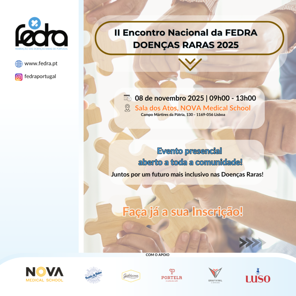 A Federação Nacional das Doenças Raras em Portugal (FEDRA) organiza, no próximo dia 8 de novembro, a segunda edição do Encontro Nacional da FEDRA Doenças Raras 2025, que decorrerá a partir das 9h00, na NOVA Medical School, em Lisboa.